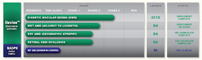 As shown in the Pipeline graphic below, Alimera is developing Iluvien devices for the treatment of wet (as an adjunct to Lucentis) and dry (for geographic atrophy) AMD and retinal vein occlusion. In addition, the company is in the pre-clinical stages of development of Nicotinamide Adenine Dinucleotide Phosphate (NADPH) oxidase inhibitor, also for treating geographic atrophy in dry AMD.