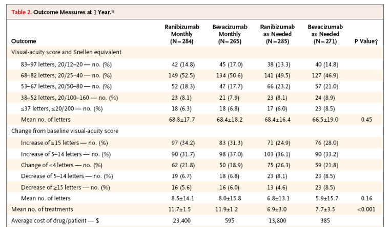 The part of Table 2 that I have chosen, again shows how close the results were for the four arms of the study, and in addition, shows the number of treatments for each arm, as well as the average annual cost to the patients, with Lucentis costing as much as 40 times the cost of Avastin. This will have an important impact on national health care costs when extrapolated to the more than 250,000 patients who are treated for neovascular AMD annually in the United States.