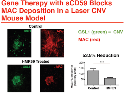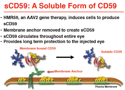 HMR59 is a gene therapy using an AAV2 vector to express a soluble form of a naturally occurring membrane bound protein called CD59 (sCD59), which blocks MAC. Membrane attack complex is the final common pathway of activation of the complement cascade, and is composed of complement factors C5b, C6, C7, C8 and C9 that assemble as a pore on cell membranes. The MAC pore induces ionic fluid shifts leading to cell destruction and ultimate death.
