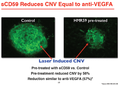 HMR59 is a novel therapy primarily targeted at geographic atrophy and other forms of dry age related macular degeneration (Dry AMD) by blocking the final stage of the complement cascade, membrane attack complex (MAC). The complement cascade is implicated via genetic studies as playing a critical role in both wet and dry AMD.