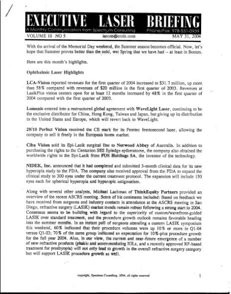 Each issue of ELB contained news releases, analyst reports, and commentary about the various companies and laser technologies making news during that time frame. Each months issue consisted of about 40-50 pages, roughly half of which was about ophthalmic lasers and the remainder about medical/surgical/cosmetic lasers.